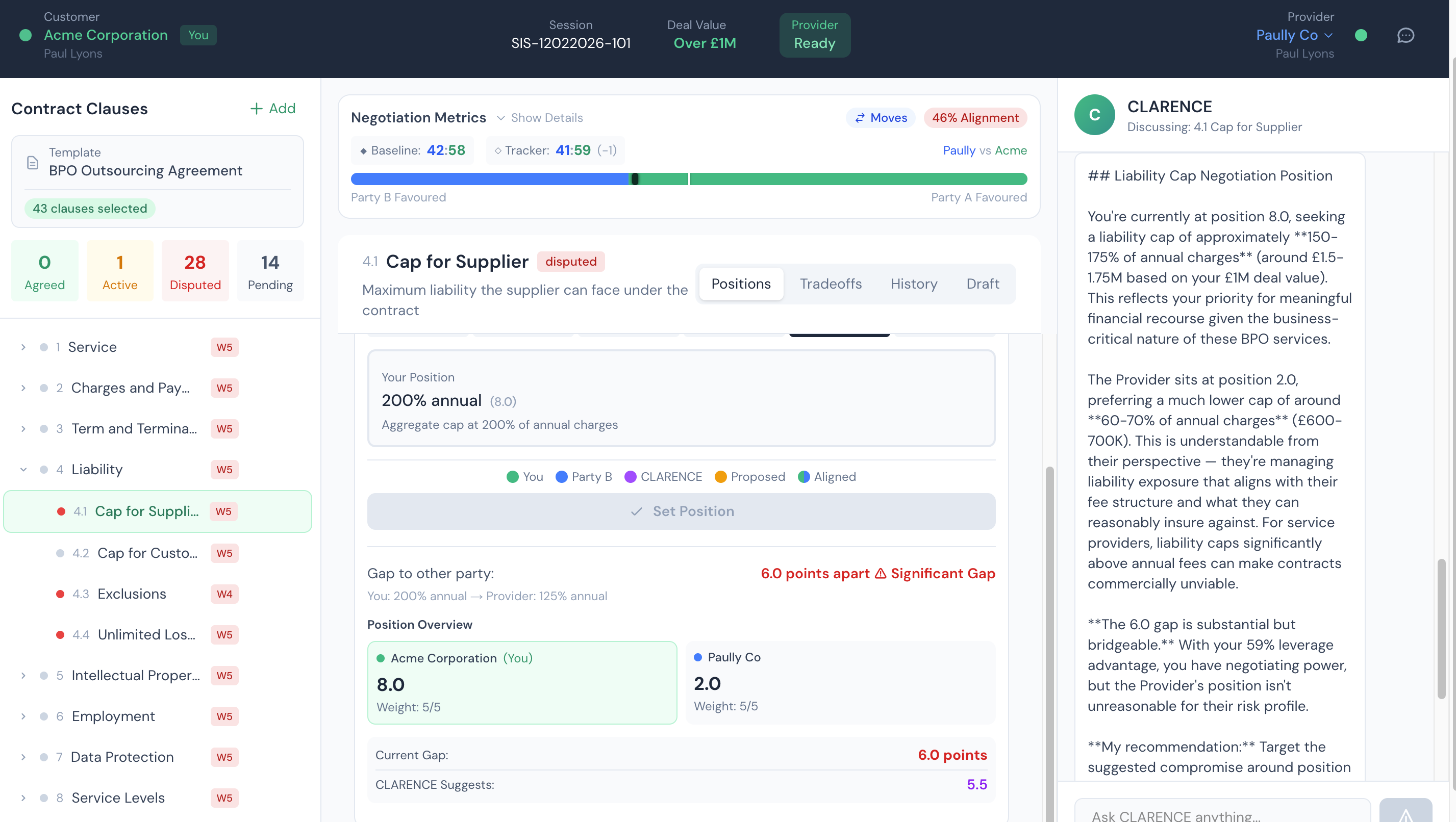The heart of Clarence. Clause-by-clause mediation with real-time leverage visibility and intelligent trade-off suggestions. Both parties see the same data.